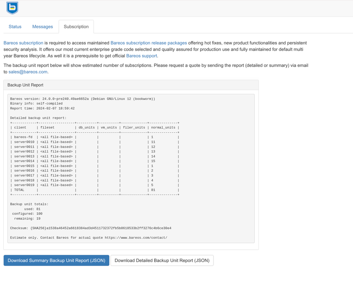 If you have (or want) a service contract for Bareos, the Backup Unit Report can help you keep track of the subscriptions in use. It will compute how many Bareos backup units are needed including optional component like database, virtual machine and filer units.